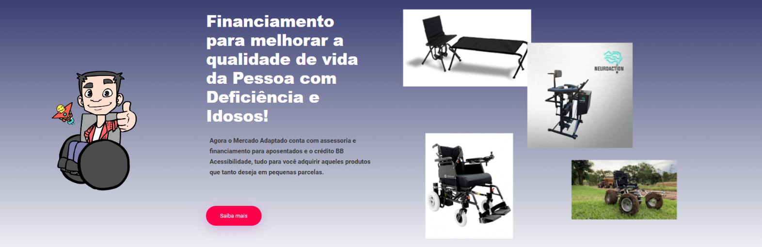 Agora o Mercado Adaptado conta com assessoria e financiamento para aposentados e o crédito BB Acessibilidade, tudo para você adquirir aqueles produtos que tanto deseja em pequenas parcelas.