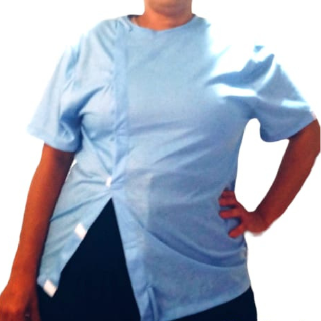 Camisas T-shirt unissex, confeccionada em tecido de poliéster, garantindo conforto e durabilidade. Possui ganchos de apoio integrados para auxiliar na abertura, fechamento em velcro proporciona praticidade e facilidade, tornando a camisa mais acessível e funcional para usuários e cuidadores.